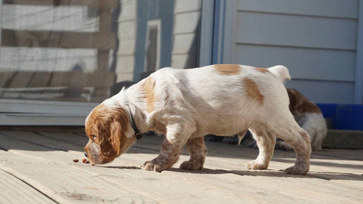 Ricola whelped a litter of three healthy puppies on December 31, 2023. There is one female and two males in the litter. The female is black and white while the males are orange and white; all of the puppies will be roaned. The litter has been registered Epagneul Breton with the UKC and Brittany with the AKC.